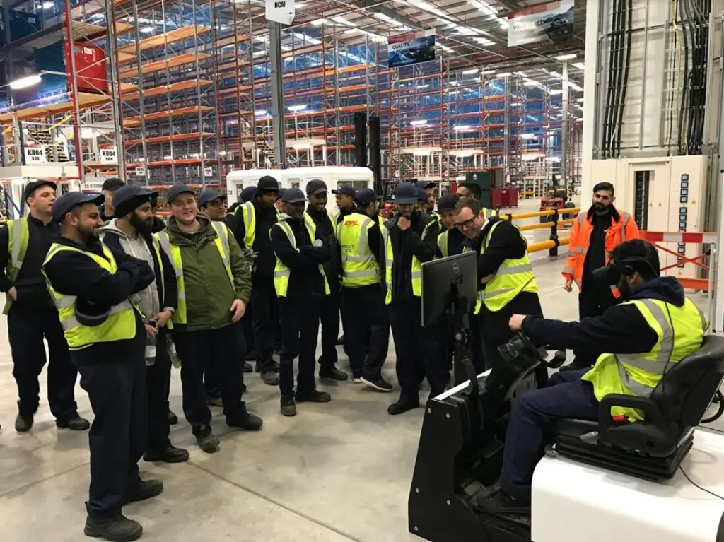 Explain that if they feel discomfort they should stop, remove the headset, and return only after they feel normal again. Don’t add pressure to squeeze in added simulator time. As we said in the intro, learning isn’t linear. If students take it slow in the beginning it may just end up paying off later. The majority of users will acclimate to a virtual environment after a few repeated experiences. Before the trainee places the headset on, introduce them to the controls: where the key is located, how the foot pedals operate, and the basics of forklift operation (steering (forward or reverse), fork controls). Explain to them the experience in a virtual warehouse and set clear expectations for them while they are training.